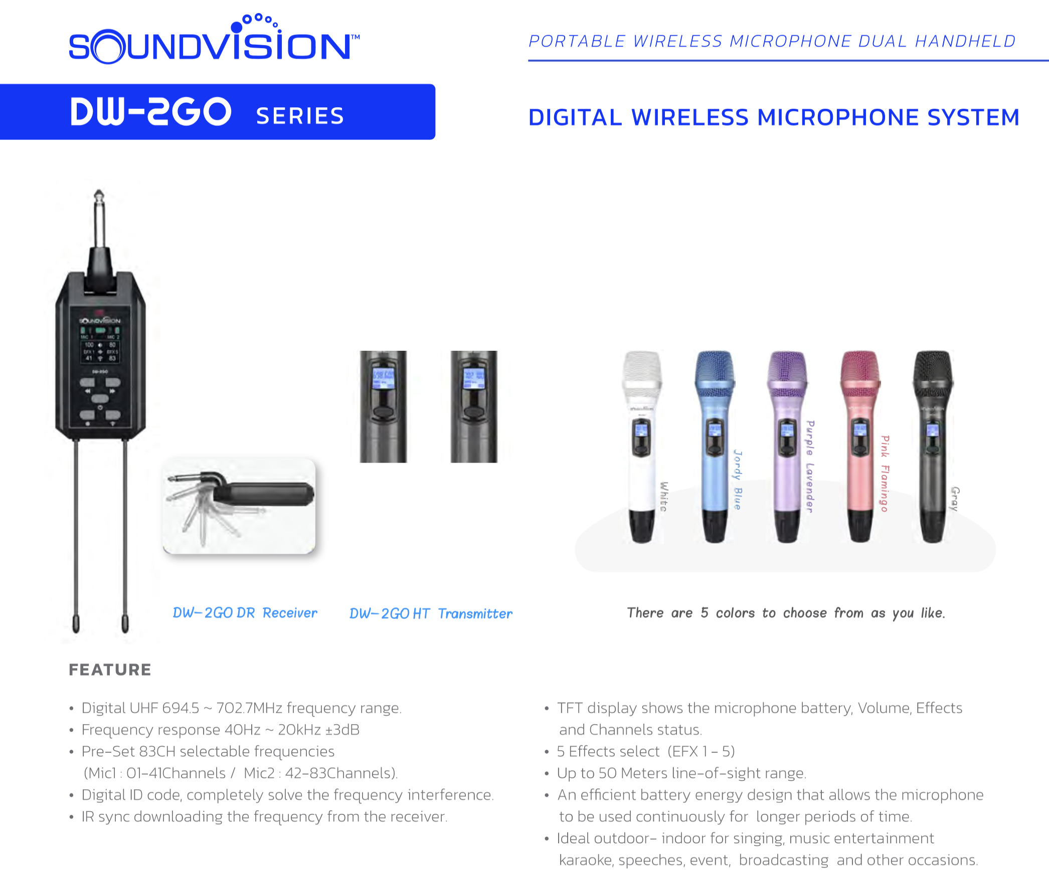 ไมโครโฟน SOUNDVISION DW-2GO ดิจิตอลไร้สาย พกพา สำหรับการใช้งานทั้งภายใน และภายนอกอาคาร ระยะการใช้งานสูงสุด 50 เมตร มีให้เลือกใช้งานถึง 5 สี