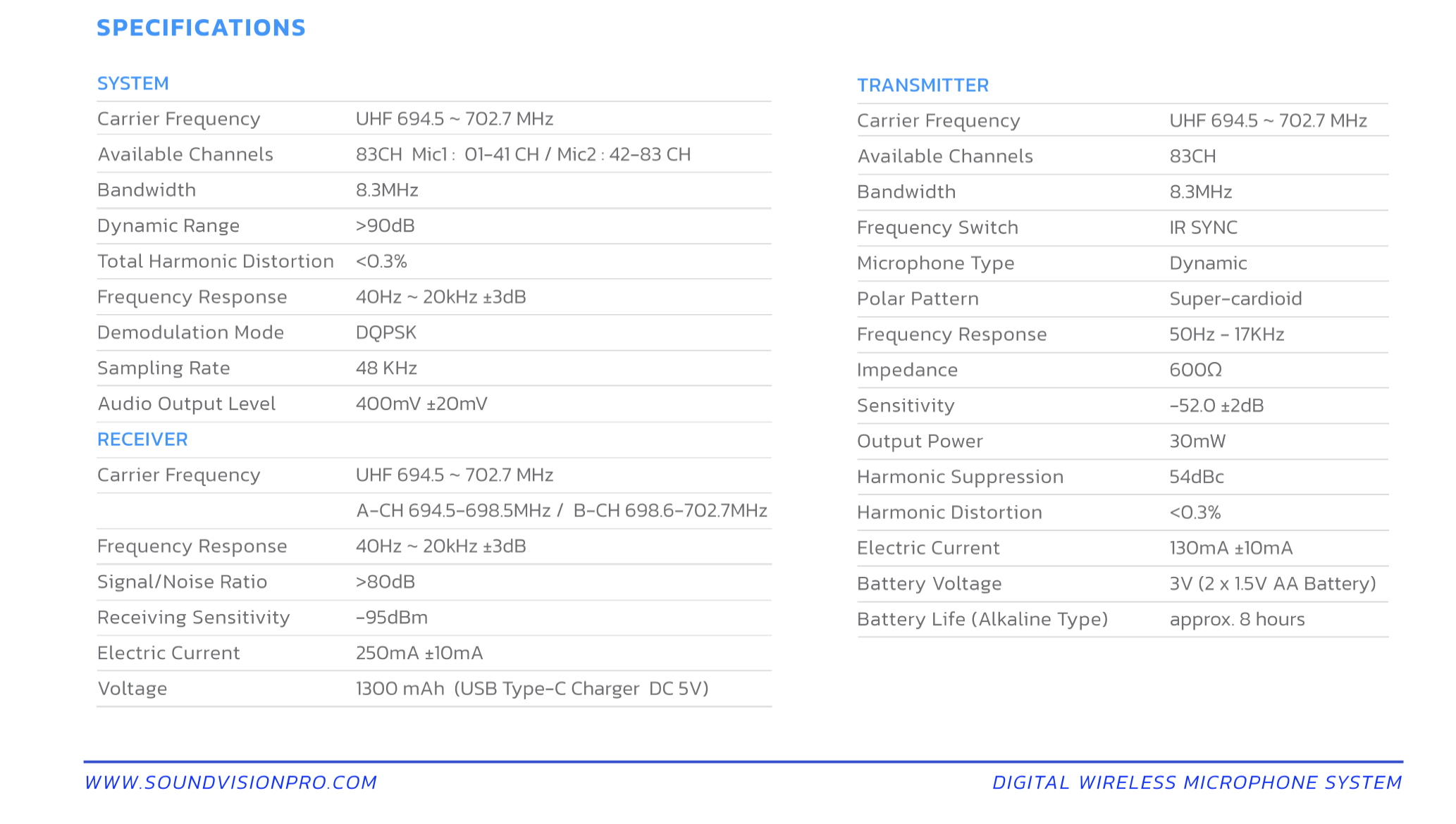 - ตั้งค่าพรีเซ็ตความถี่ ได้มากถึง 83 ชาแนล (Mic 1 : 01 41 ชาแนล / Mic 2 : 42 83 ชาแนล)
